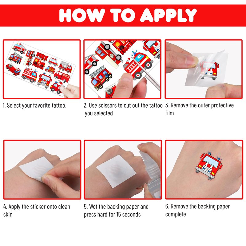- FIRE TRUCK TATTOOS : It belongs to our popular collection and will accommodate your expectations at birthday party, party decorations, and special celebrations. Each tattoo set covers 8 sheets in total with 96 Pcs. The dimension of each sheet is 6.1*3.1 inches, including tattoo pieces that have proportions reasonable for adults to kids. Our tattoo stickers designed in different styles promise to develop the impression for the party