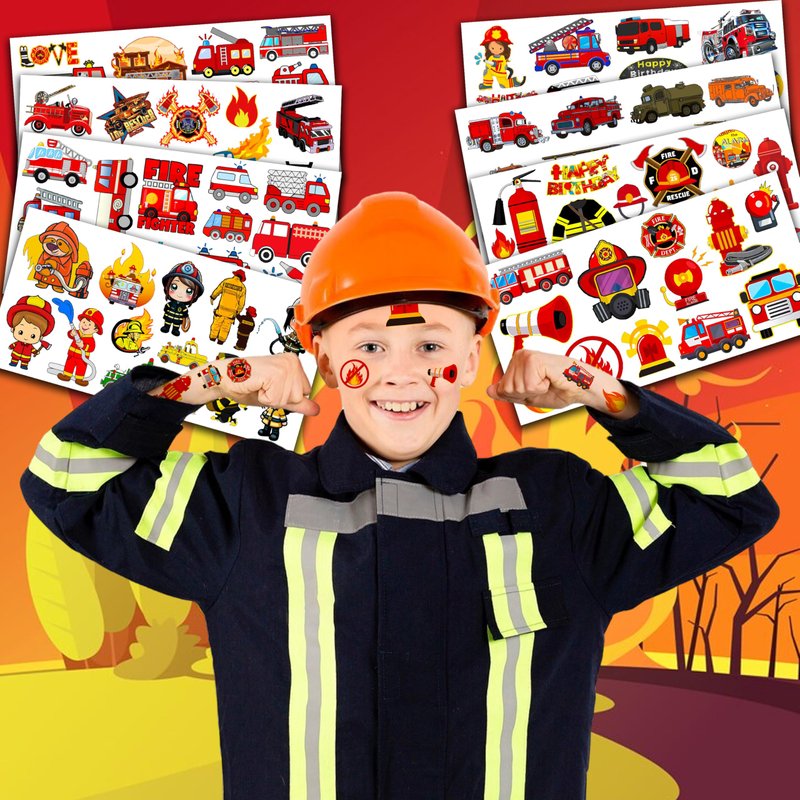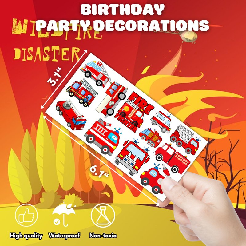 - FIRE TRUCK BIRTHDAY PARTY : If you haven’t had the option for FIRE TRUCK birthday party decorations yet, FIRE FIGHTER tattoos complete with FIRE TRUCK accessories, FIRE TRUCK car, FIRE TRUCK lights, FIRE TRUCK hat, FIRE TRUCK can will be a terrific choice for children on their momentous day. Sure enough to believe that kids have fun playing with our tattoo stickers. The tattoo is the best gift for a birthday party together with the significant meaning that it says