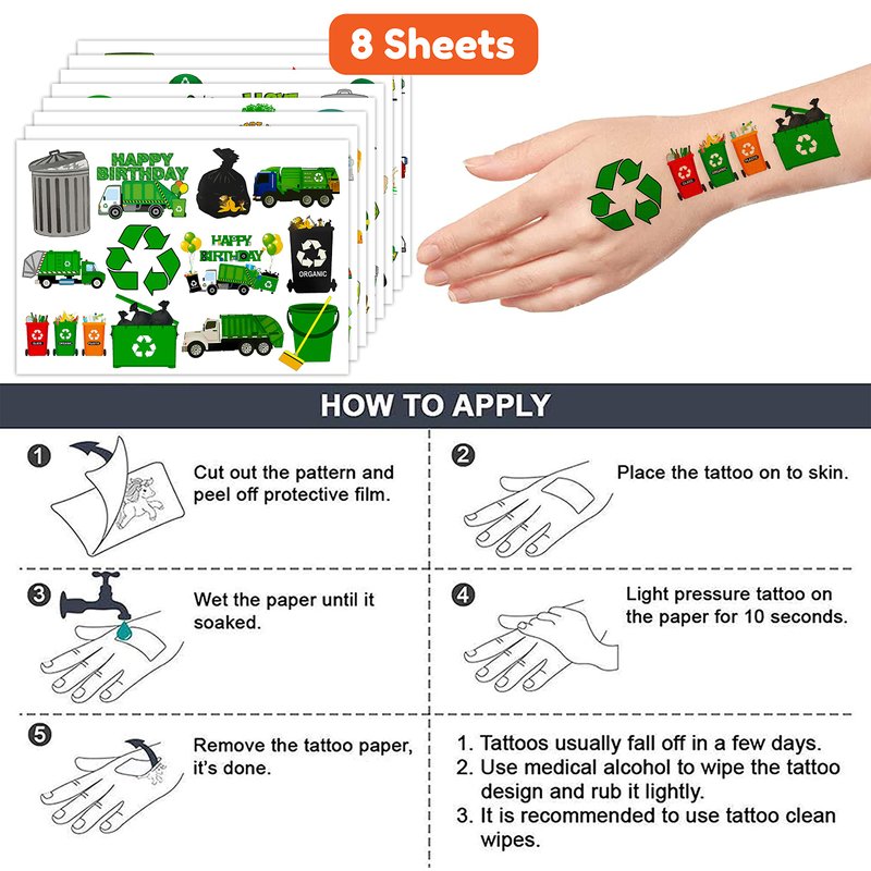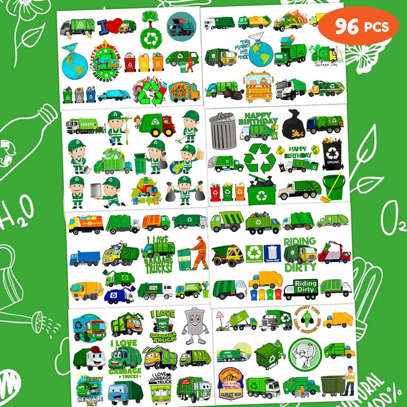 - GARBAGE TRUCK TATTOOS: It belongs to our popular collection and will accommodate your expectations at birthday party, party decorations, and special celebrations. Each tattoo set covers 8 sheets in total with 96 Pcs. The dimension of each sheet is 6.1*3.1 inches, including tattoo pieces that have proportions reasonable for adults to kids. Our tattoo stickers designed in different styles promise to develop the impression for the party