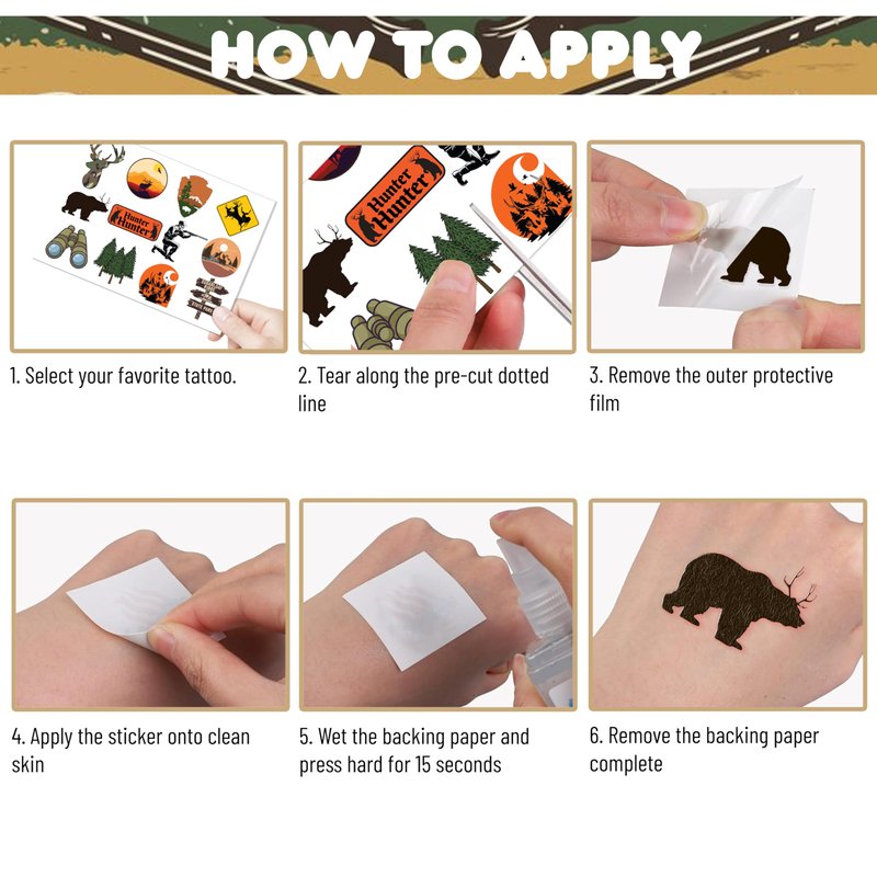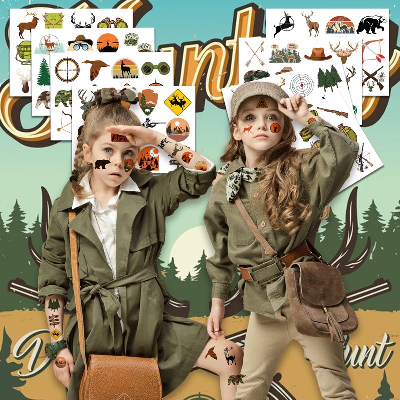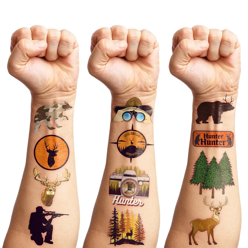 - HUNTING PARTY FAVORS SUPPLIES: HUNTING tattoos that belong to children having an exploring passion for wild lives. Our temporary tattoos product includes kinds of unique tattoos about the military and HUNTING race. HUNTING tattoos album makes children feel like brave warriors in nature landscapes. During the moments of party, children have no boredom at all replaced with cheer plus excitement when they play with our tattoos^^