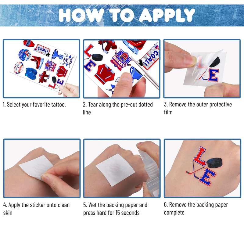 • HOCKEY BIRTHDAY PARTY SUPPLIES : It belongs to our popular collection and will accommodate your expectations at birthday party, party decorations, and special celebrations. Each tattoo set covers 8 sheets in total with 96 Pcs. The dimension of each sheet is 6.1*3.1 inches, including tattoo pieces that have proportions reasonable for adults to kids. Our tattoo stickers designed in different styles promise to develop the impression for the party