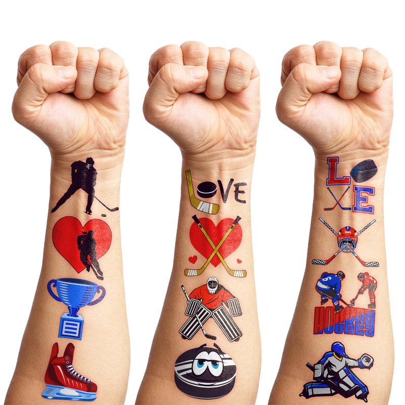 • HOCKEY TEMPORARY TATTOOS: If you haven’t had the option for HOCKEY themed birthday party decorations yet,HOCKEY tattoos complete with net, HOCKEY pucks, HOCKEY helmet, field HOCKEY, HOCKEY skates, HOCKEY mask, HOCKEY hat, HOCKEY balls will be a terrific choice for children on their momentous day. Sure enough to believe that kids have fun playing with our tattoo stickers. The tattoo is the best gift for a birthday party together with the significant meaning that it says