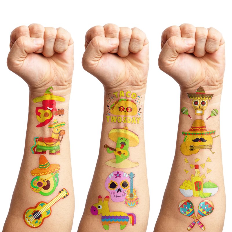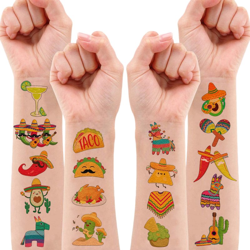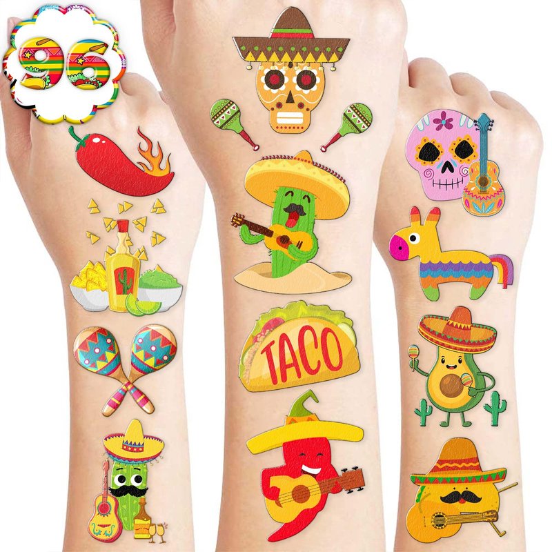 - TACO TWOSDAY BIRTHDAY PARTY : TACO temporary tattoos with the vibrant green, red and yellow color include cactus, avocado, guitar, llama, taco, chili and mexican food. These temporary tattoos are the must-have item in party, kids have no boredom at all that replaces with cheer plus excitement when you play with our tattoos^^
