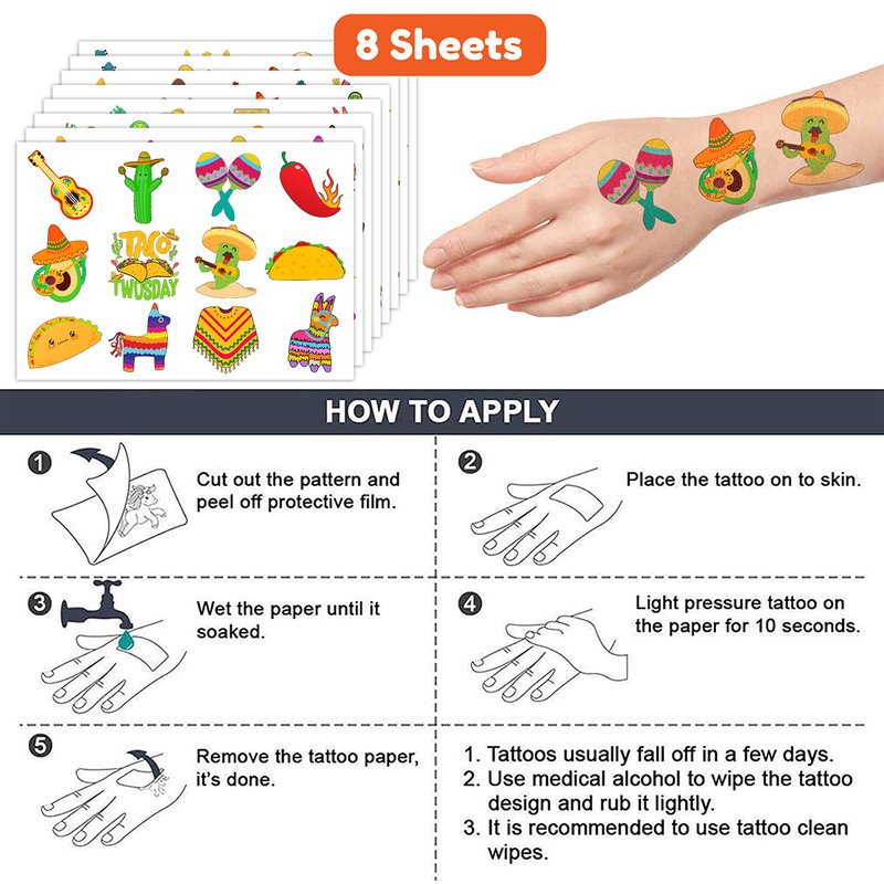 - TACO PARTY: TACO TWOSDAY tattoos pertaining to our popular collection will accommodate your expectations at Birthday party, party decorations, special celebrations. Each tattoos set covers 8 sheets in total with 96 Pcs. The dimension of each sheet is 6.1*3.1 inches, including tattoo pieces that have proportions reasonable for adults to kids. Our tattoo stickers designed to different styles promise to develop the impression for party^^