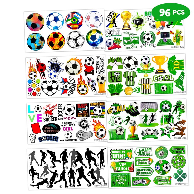 - SOCCER BIRTHDAY PARTY: It belongs to our popular collection and will accommodate your expectations at birthday party, party decorations, and special celebrations. Each tattoo set covers 8 sheets in total with 96 Pcs. The dimension of each sheet is 6.1*3.1 inches, including tattoo pieces that have proportions reasonable for adults to kids. Our tattoo stickers designed in different styles promise to develop the impression for the party