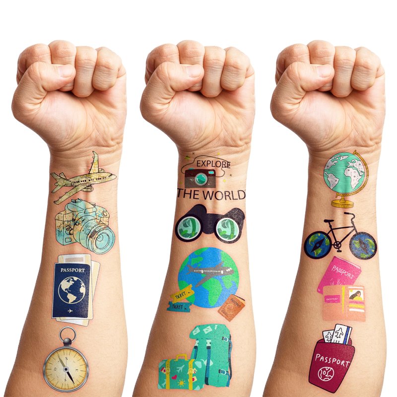 - TRAVEL THEME PARTY DECORATIONS: Your party will have the awesome experience all over the world if you choose our TRAVEL tattoo stickers. Travel tattoos collection include traveler costume, passport, suitcase, map, globe. You have no sadness at all replaced with excitement when you play with our tattoos