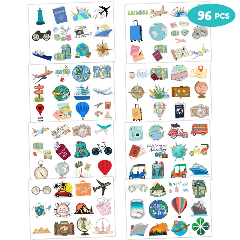 - TRAVEL THEME PARTY: TRAVEL tattoo pertaining to our popular party favors will accommodate children’s expectations at Birthday party, party decorations, special celebration and other festival. Each tattoo set covers 8 sheets in total with 96 Pcs.The dimension of each sheet is 6.1*3.1 inches, including tattoo pieces that have proportions reasonable for adults to kids. Tattoo stickers designed to different styles promise to develop the impression for party