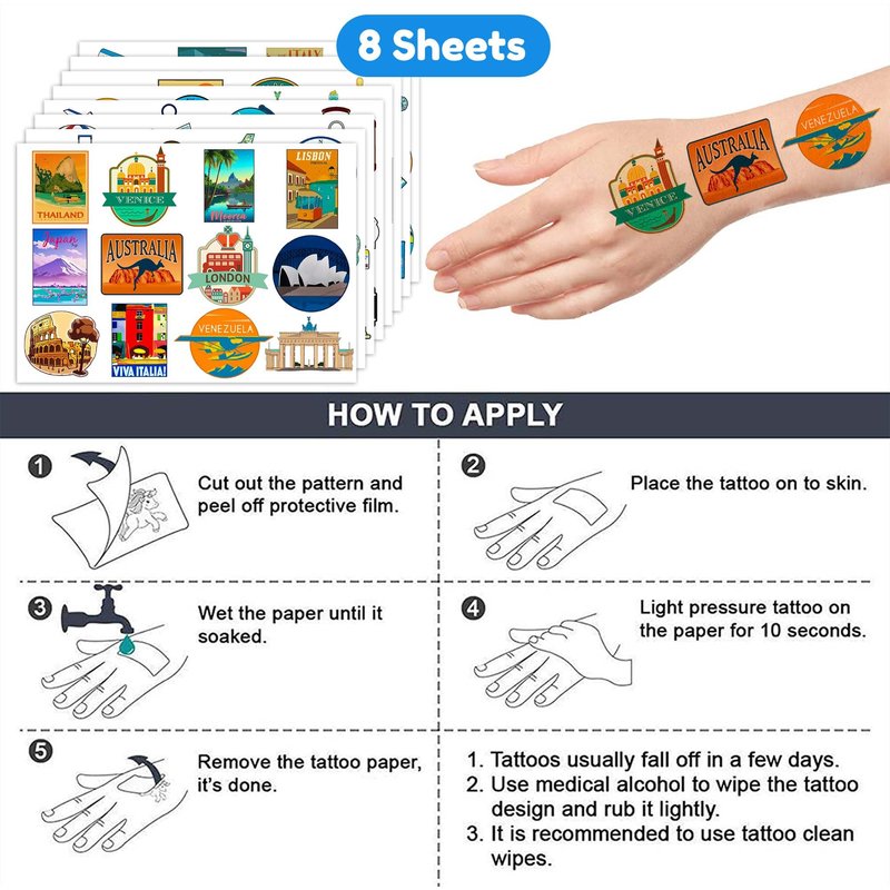 - TRAVEL THEME PARTY: It belongs to our popular collection and will accommodate your expectations at birthday party, party decorations, and special celebrations. Each tattoo set covers 8 sheets in total with 96 Pcs. The dimension of each sheet is 6.1*3.1 inches, including tattoo pieces that have proportions reasonable for adults to kids. Our tattoo stickers designed in different styles promise to develop the impression for the party ^^