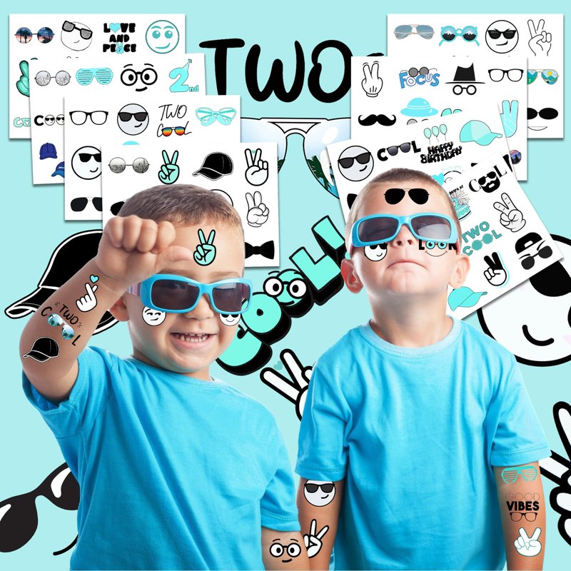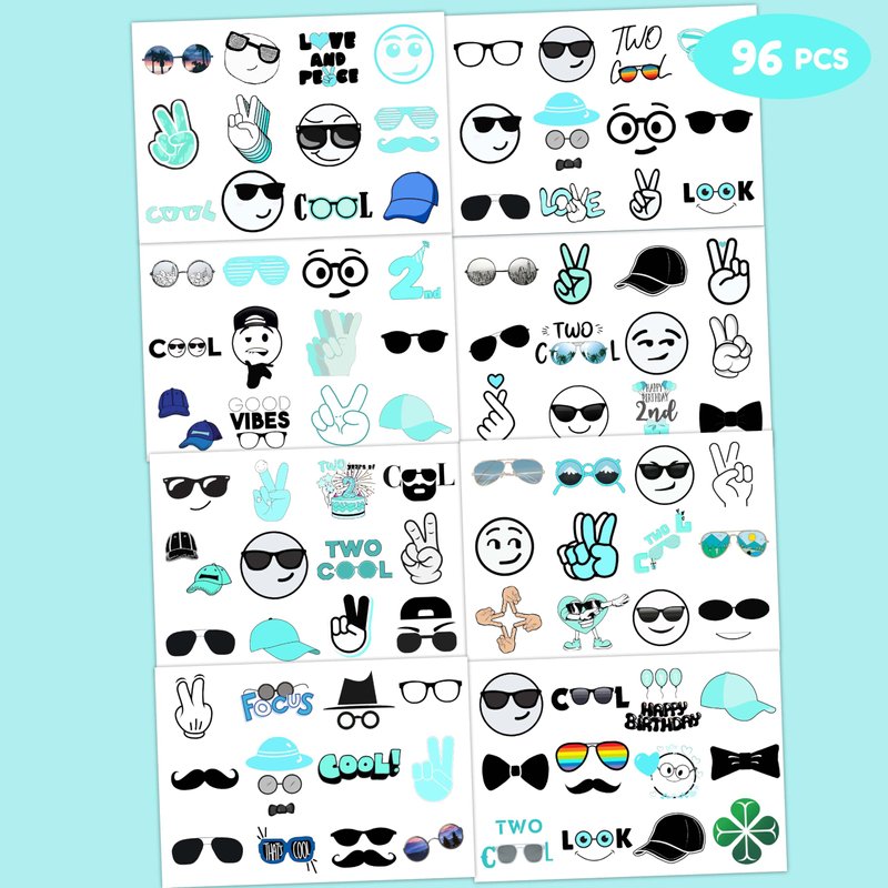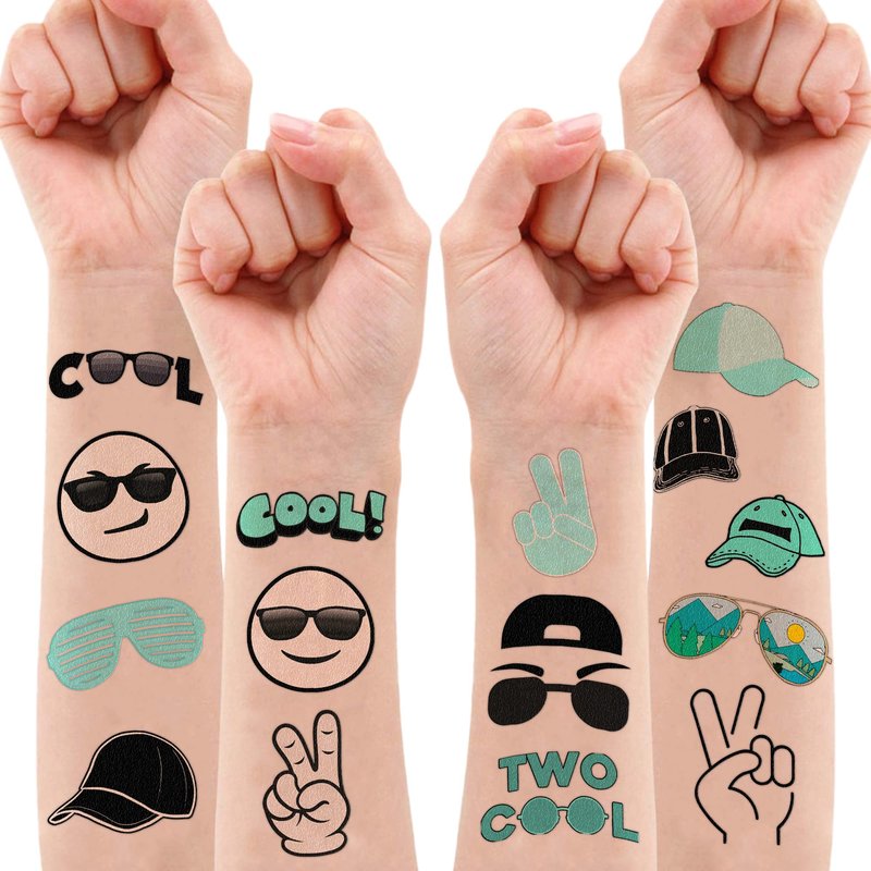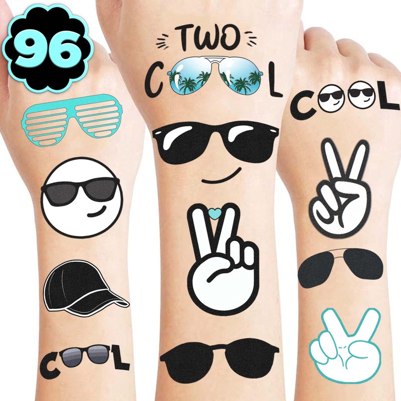 TWO COOL PARTY: COOL TATTOOS pertaining to our popular collection will accommodate your expectations at Birthday party, party decorations, special celebrations. Each tattoos set covers 8 sheets in total with 96 Pcs. The dimension of each sheet is 6.1*3.1 inches, including tattoo pieces that have proportions reasonable for adults to kids. Our tattoo stickers designed to different styles promise to develop the impression for party. TWO COOL PARTY DECORATIONS: COOL TATTOOS with the main black color including hat, glasses, peace sign, emoji. These temporary tattoos will be not wasted thing in party, kids have no boredom at all that replaces with cheer plus excitement when they play with our tattoos. SAFE AND HIGH QUALITY: Our temporary tattoos are made of environmentally friendly materials and non-toxic, These tattoos are made of high-quality safety and green paper. USAGE: Cut each tattoo out of sheets and remove the sheet clearly. You can stick it on hands, face, arms or wherever you feel safe. Moreover, you put it down on glasses, clothes, and a smooth flat . After that, you wet it thoroughly with water and wait for 20-30 seconds, you get rid of the backing paper. As a result, you have a velvety tattoo as we say. Not recommended for people with a history of sensitive skin, if symptoms appear, stop using immediately. SATISFACTORY SERVICE: If you have difficulty using our product, contact us. We will make sure to solve problems and help you have a wonderful buying experience.