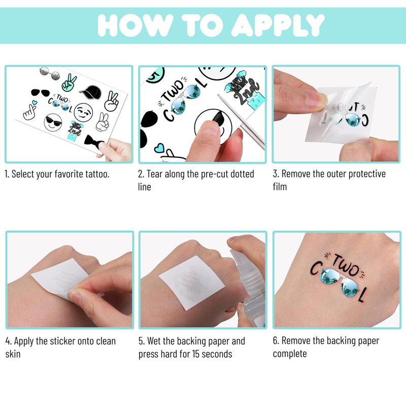 - USAGE: Cut each tattoo out of sheets and remove the sheet clearly.You can stick it on hands, face, arms or wherever you feel safe. Moreover, you put it down on glasses, clothes, and a smooth flat . After that, you wet it thoroughly with water and wait for 20-30 seconds, you get rid of the backing paper. As a result, you have a velvety tattoo as we say. Not recommended for people with a history of sensitive skin, if symptoms appear, stop using immediately