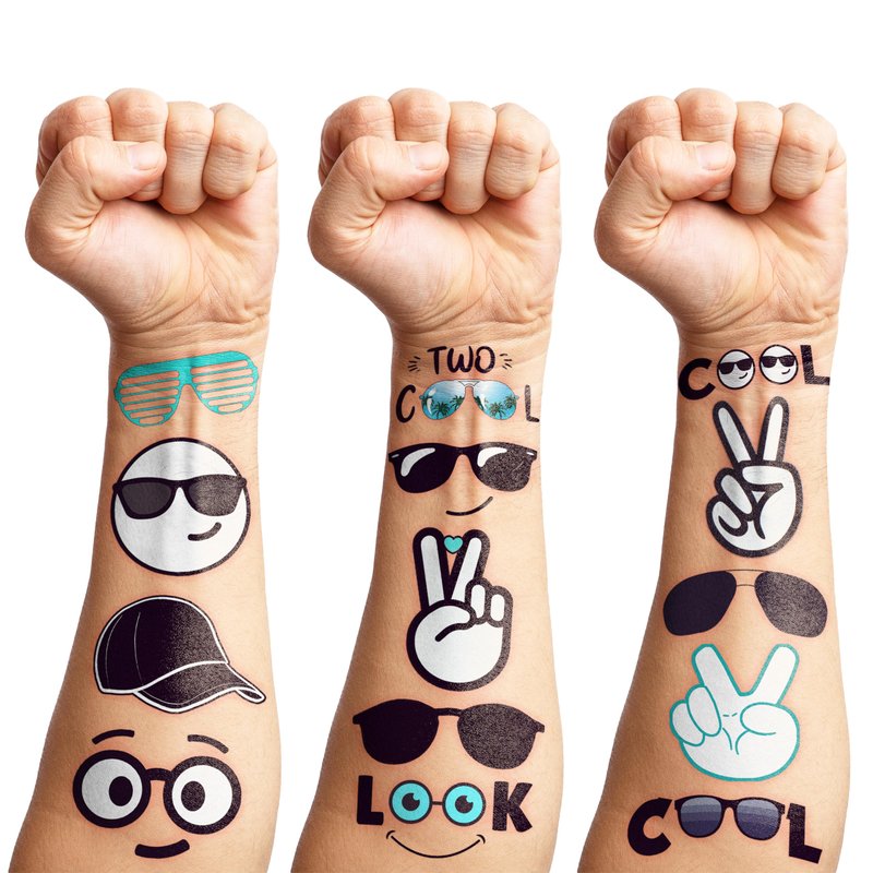 - TWO COOL PARTY DECORATIONS: COOL TATTOOS with the main black color including hat, glasses, peace sign, emoji. These temporary tattoos will be not wasted thing in party, kids have no boredom at all that replaces with cheer plus excitement when they play with our tattoos
