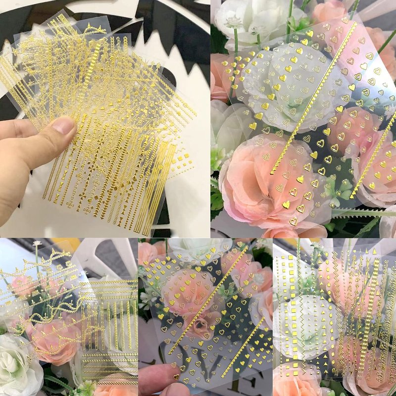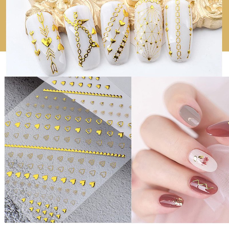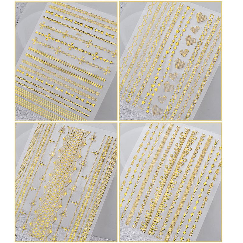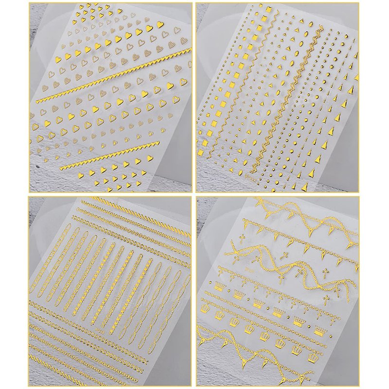 - Quantity: 8 Sheets gold chains strips nail art sticker, each paper measures 3.5 x 3.1 inches(9 x 8 cm). Contains a variety of patterns: heart, chains, line, wave point, triangle etc. These nail stickers are perfect for matching other nail art.