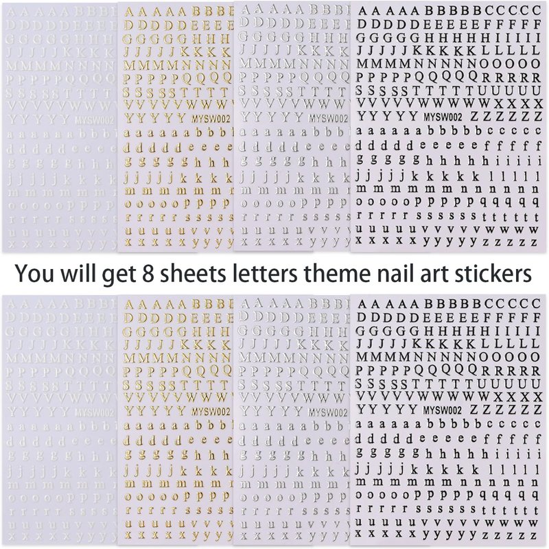 - Package: You will get 8 sheets letter theme nail art stickers, Can add a strong fashion atmosphere. Perfect for women girls, exquisite nail design, DIY fashion nail decoration.
