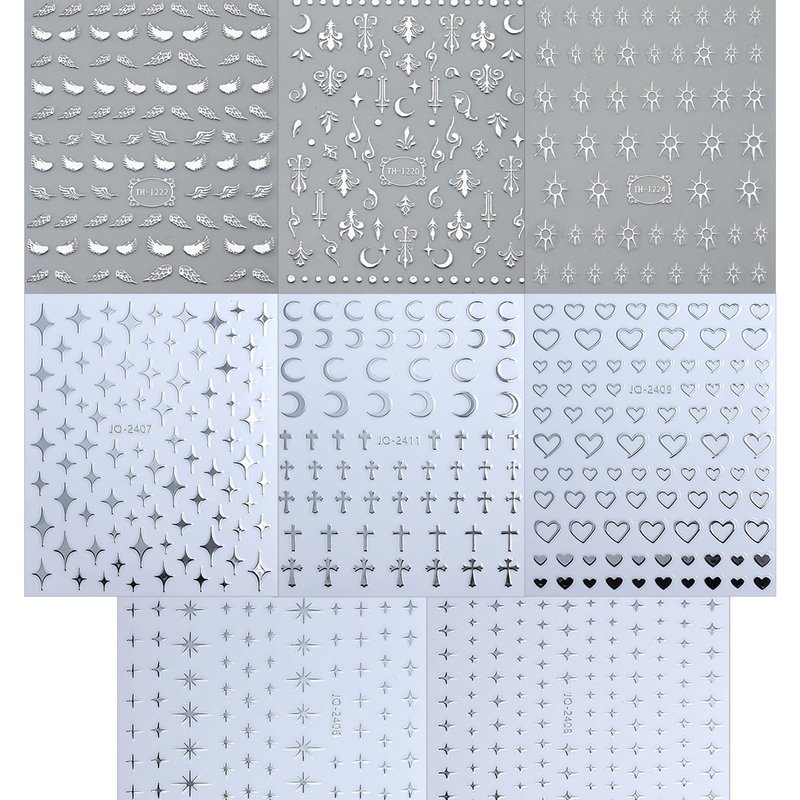 8 Sheets Silver Nail Art Stickers Decals Angel Wings Crosses Nail Stickers Sun Stars Moon Totem Design Nail Decals 3D Self-Adhesive Nail Stickers for Women Manicure Decoration