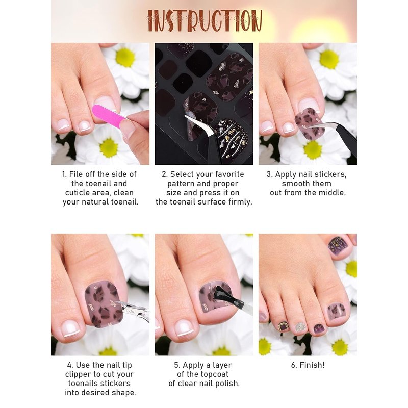 - Easy to use:Sparkly toe polish strips are so much quicker and easier than using traditional nail polish. These toe stickers are self-adhesive, stick it gently on your toenail and cut it to fit your toenail well, then use the nail file to file the edges gently to make it smooth.