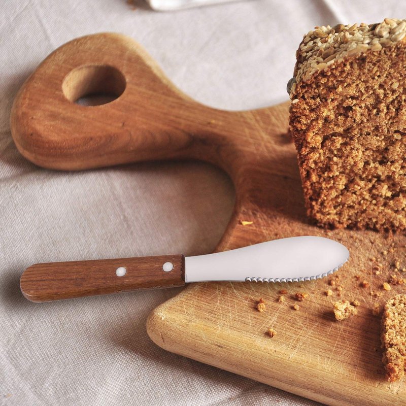 - Ergonomic handle with wooden handle grip, reduces hand fatigue and allows for precision and control. The handle is designed in a way which give adequate leverage and grip with just the right amount of weight. The wide stainless steel straight edge blade saves time when spreading condiments of any kind in seconds.