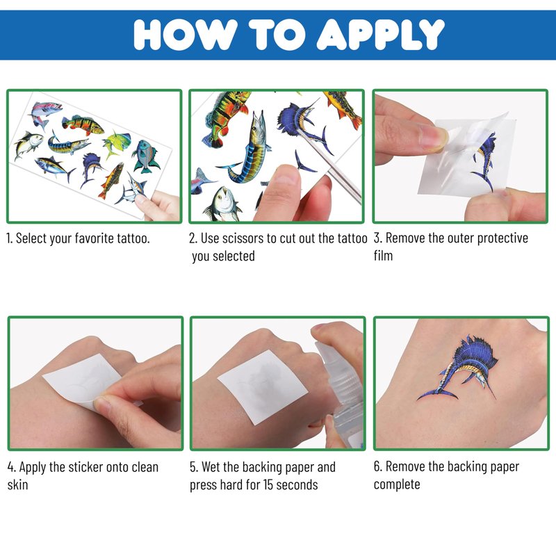 - 🐟 EASY TO USE AND REMOVE : You can place them on your hands, arms, face, or any comfortable area. Simply cut out each tattoo from the sheets and remove the clear protective layer. Wet the tattoo thoroughly with water, wait for 20-30 seconds, and then remove the backing paper. The result will be a velvety, long-lasting tattoo.