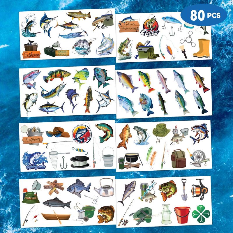 80 PCS Gone Fishing Temporary Tattoos Sticker Ocean Sea Fish Themed Birthday Party Decorations Supplies Favors Gifts Girls Boys Baby Showers Prizes Cute Tattoo School Reward Fisherman Lake