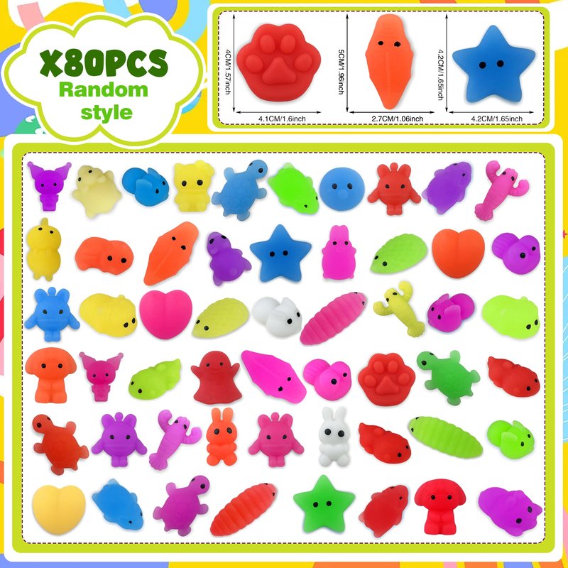 Introducing the Squishies Mochi Squishy Toys - a collection of 80PCS colorful animal-themed Mochi Squishy Toy bulk, made of good TPR material. These squishy animals toys are perfect for people who are looking for a fun and stress-relieving way to pass the time. Each Mochi Squishy Toy is individually packaged, making it perfect for party favors, goodie bag stocking stuffers, or classroom prizes. With various forms and soft touch, they make excellent décor for your desk at work or home. These Squishy Animals Toys make fantastic birthday gifts for people or anyone who loves cute and quirky animal designs. These Mochi Squishy Toys come in different shapes,making it easy to find something for everyone. Whether you're squeezing one to reduce stress or collecting the whole pack, these Squishies Mochi Squishy Toys are a must-have for anyone looking for a fun and playful way to express their personality. They make perfect companions for meditating, fidgeting, or simply relaxing. In conclusion, if you're looking for a fun and unusual way to relieve stress, bond with friends, or decorate your workspace, these Mochi Squishy Toys are the way to go! So why wait? Choose your favorite Squishies Mochi Squishy Toy design, and enjoy the calming feeling of squeezing them all day long.