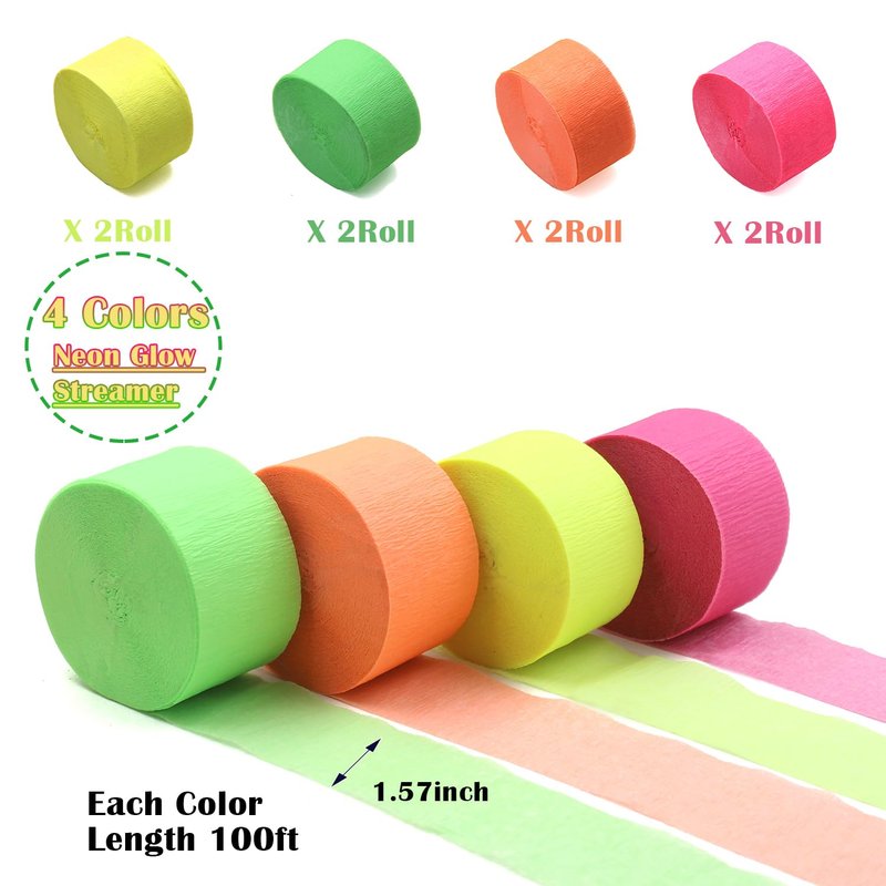 - 【GREAT VALUE】 8 Rolls Crepe paper streamers color in green, orange, yellow ,pink. 800 feet/Each roll measures approx. 1.6 inches in width and 100 ft in length. They can emit bright colors under normal light, but they glow under black light, exquisite decorations can make your party more attractive!