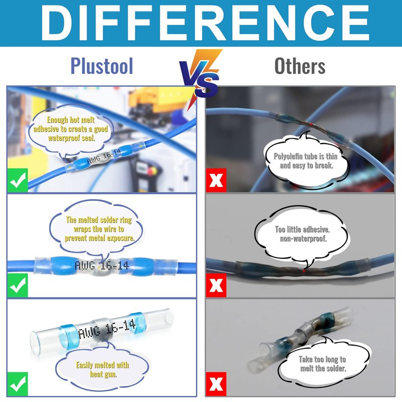 - ❣【Premium Solder Seal Ring】- Plustool solder seal wire connectors are composed of high-purity and thick solder rings. The enough solder around the wire, melt and flow until form seal on the wire. Shrinking ratio: 2:1. Tubing reduces in size and solder will melt and flow through the stripped wires, ensure strong holding --- your wire will never slip out of the connector.