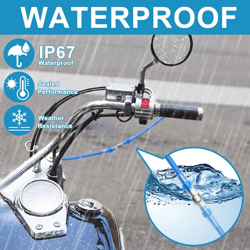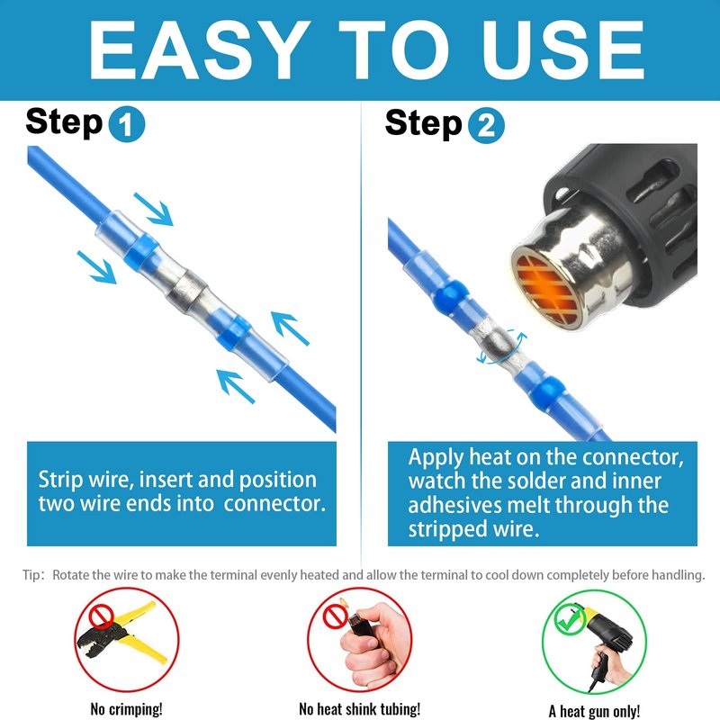 - ❣【Improved Technology】- Lower temperature solder will melt faster and prevent burns in the insulation tubing. Wire connectors features exclusive material to avoid shrink tubing melting before solder ring. Excellent stability, water resistance and electrical conductivity provide durable connection for motorcycle, off-road vehicles, lawn tractors, RVs, fish finder and marine application.
