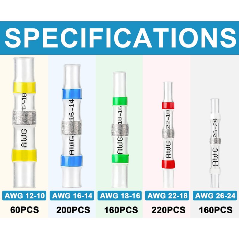 - ❣【Quality Commitment】- Easy to carry kit with a great assortment. The 800PCS kit includes solder seal wire connectors Red 220PCS,Blue 200PCS,Green 160PCS,White 160PCS,Yellow 60PCS. Plustool electrical wire connectors butts comply with CE, RoHS, ISO9001, SGS standards. For any reason you're not satisfied with this deal, you're covered by our 60 day NO-QUESTION-ASKED MONEY BACK.