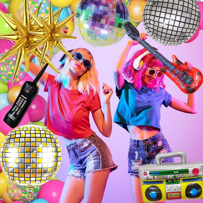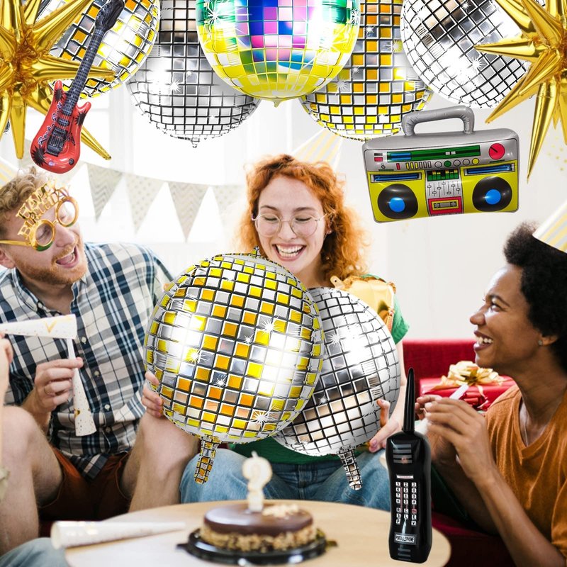 - Package Includes: The 80s 90s balloons kit includes 9 inflatable foil 22" disco ball balloons in three different colors, 3 of each color. Comes with 3 pieces of gold exploding star balloons, 1 boom box balloon, 1 mobile phone balloon, 1 guitar balloon, and 2 pieces of silver ribbon. Enough quantity, nice combination and perfect size for your party decoration needs.
