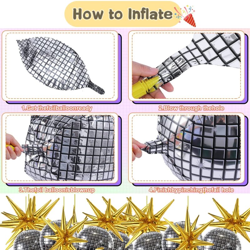 Easy to Use: Our disco ball balloons are extremely simple to inflate: locate the filling tab, insert the pump or straw, and fill with air; they are self-sealing, so no tying is required.