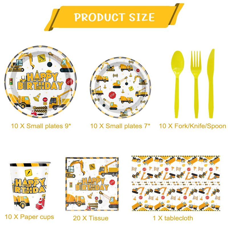 - Variety of Items: This 81-piece party tableware set includes 1Pcs 42inch× 71inch tablecloth 10Pcs 7inch dessert plates,10Pcs 9inch dinner plates,20Pcs 6.5 x 6.5 inch napkins ,10Pcs fork,10Pcs spoons,10Pcs knives, 10Pcs cup for Boys Construction Themed Birthday Party Decorations.