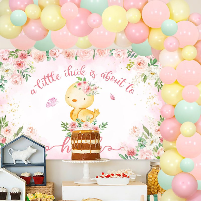 • Chicken Themed Backdrop: The backdrop features pink flowers and chick silhouettes printed on durable material that measures 5 x 3 ft for a focal point photo station.The letter "a little chick is about to hatch" printed on the backdrop is very suitable for baby shower parties.