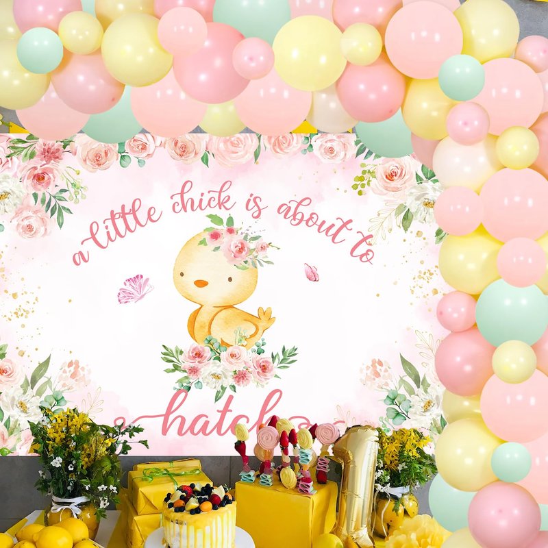 • Chick Balloon Garland Arch: This balloon garland arch is paired with a chicken themed backdrop, featuring yellow, pink, and green, adding a touch of creativity and welcoming guests in a fashionable way. It can also serve as a background to make the party unforgettable.
