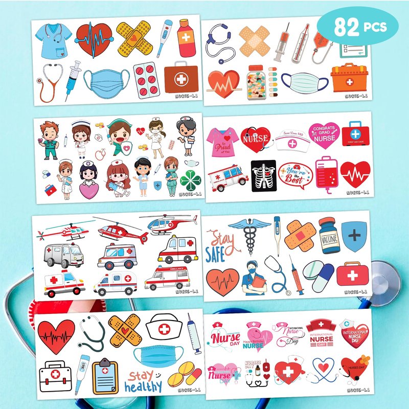 - ❤️🩹 TATTOOS FOR NURSE DAY GRADUATION -THEMED DECORATION : Nurse tattoos for people who love Nurse. Featuring 8 sheets with 82 pcs of lovely, fun and colorful design. Each sheet measures 6.1 * 3.1 inches. You can temporarily tattoo them on your body or objects such as phones, bottles, laptop…