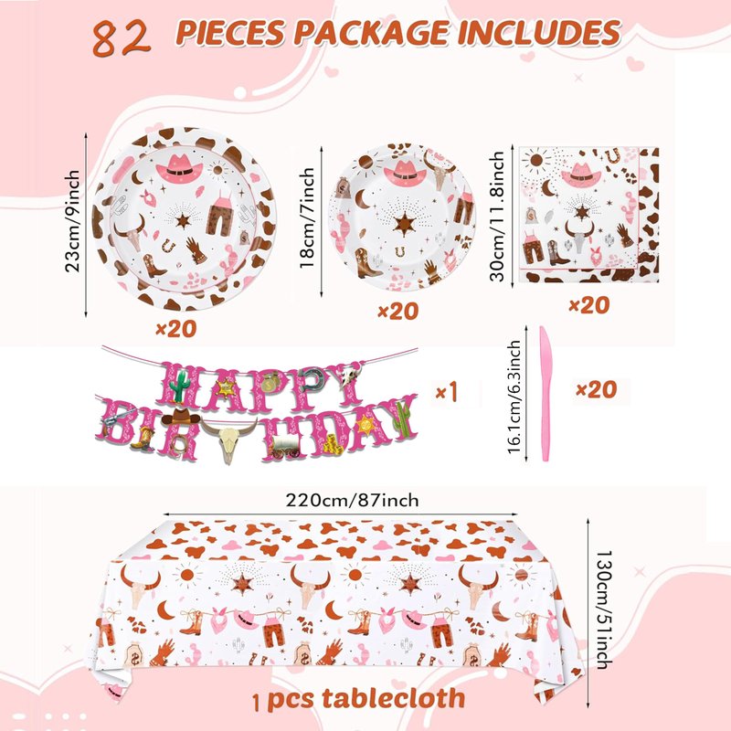 82Pcs Western Cowgirl Birthday Party Decorations Cowgirl Party Supplies Include Birthday Banner Plate Napkin Tablecloth Knives for Wild West Cowgirl Theme Birthday Party Decorations Dinnerware