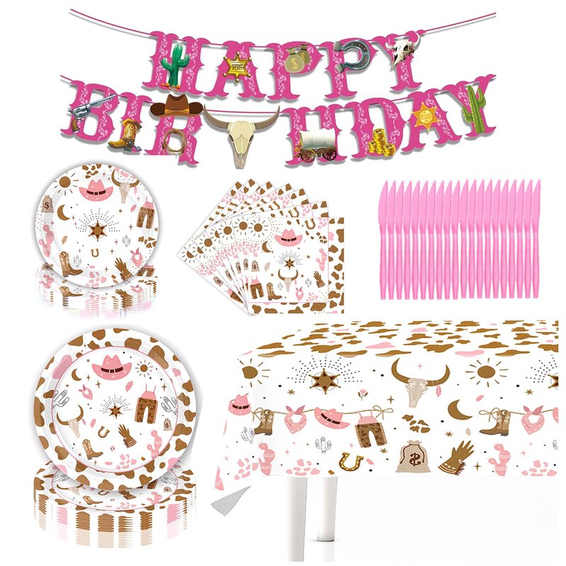 Western Cowgirl Party Supplies decoration for Birthday Party,Theme Party,Family Party,Picnic Party,Housewarming Party,Baby shower Party,Bachelorette Party and Holiday Party Enjoy your party time The Wild Western cowgirl birthday party decorations are all disposable and convenience,The tablecloth can keep your tables away from stains of spilled milk, juice, oil or soda, simply toss them away or wipe them down to clean them up and store for next time, save your time on cleaning and enjoy the party with your family,kids and friends. Occasion:Birthday party,Family Party,Networking Event,Outdoor Picnic Specifications: Main materials: High-quality paper and plastic,Fade-resistance Colors: Mixed colour as shown in the picture Quantity: 82PCS Size: Party plates: 9”inch Dessert plates:7”inch Tablecloths: approx 51.2 x 81.6 inches/ 130 x 220 cm Napkins: approx 6.5 x 6.5 inches/ 16.5 x 16.5 cm Banner: Wild Western Cowgirl Party Supplies and Decorations includes: 20 x 9'' Cowgirl theme party plates 20 x 7'' Cowgirl theme dessert plates 20 x Cowgirl theme napkins 20 x Knives 1 x Cowgirl tablecloth 1 x Cowgirl banner Warm notes: Please allow a little error on the size by manual measurement. The color might have a slight difference due to different screen displays. The banner requires to be assembled by yourself upon arrival. Please do not put the plates into the microwave.