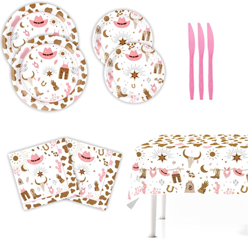 - 【Cowgirl Party Supplies quantity】 Enough kits for 20 guests,The package includes 20pcs 9'' cowgirl party dinner plates, 20pcs 7'' dessert plates, 20pcs stylish 6.5” paper napkins,20pcs 6.33” Knives,1tablescloth that measure about 51.2”×86.6” inches and 1 cowgirl banner totally 96pcs .Which are sufficient to meet your festival uses and decorative needs, making your home full of cool atmosphere.