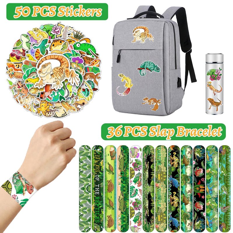 86PCS Reptile Party Favors 50PCS Reptile Stickers 36PCS Reptile Slap Bracelets Alligator Lizard Gecko Snake Turtle Snap Bracelet Reptile Stickers for Kids Reptile Party Supplies Decorations Gifts
