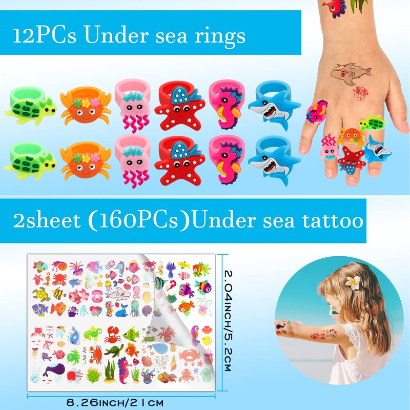 • GREAT VALUE AND VARIETY SHAPE---the package came with 96Pcs party favors in all. Include 12* sea animal slap bracelets, 12*cute sea animal rings, 12* sea animal keychains, 10*under the sea themed stamper, 40Pcs stickers, 2* tattoos for kids, enough for your party.