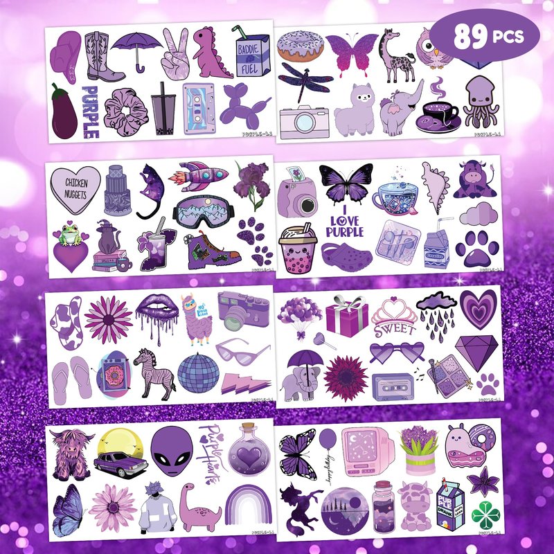 89 PCS Funny Purple Temporary Tattoos Sticker Dark Purple Birthday Party Supplies Decorations Favors Celebration Gifts Boys Girls Baby Shower Adult Cute Tattoo School Prizes Reward Themed
