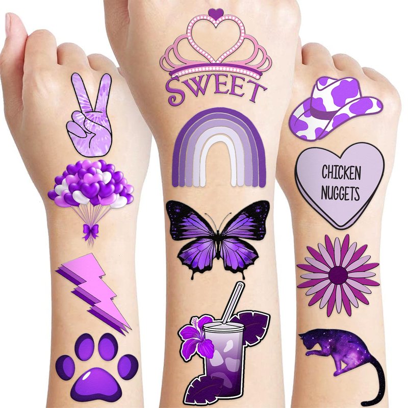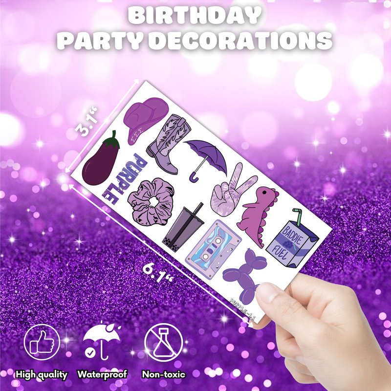- 💜FUN GIFT FOR PURPLE BIRTHDAY PARTY DECORATIONS SUPPLIES: PURPLE TATTOOS for themed party, outdoor parties, birthday parties, school rewards and other party events. PURPLE TATTOOS are also interesting and lovely gifts for your children. Complement your unique collection with a purple tattoo!