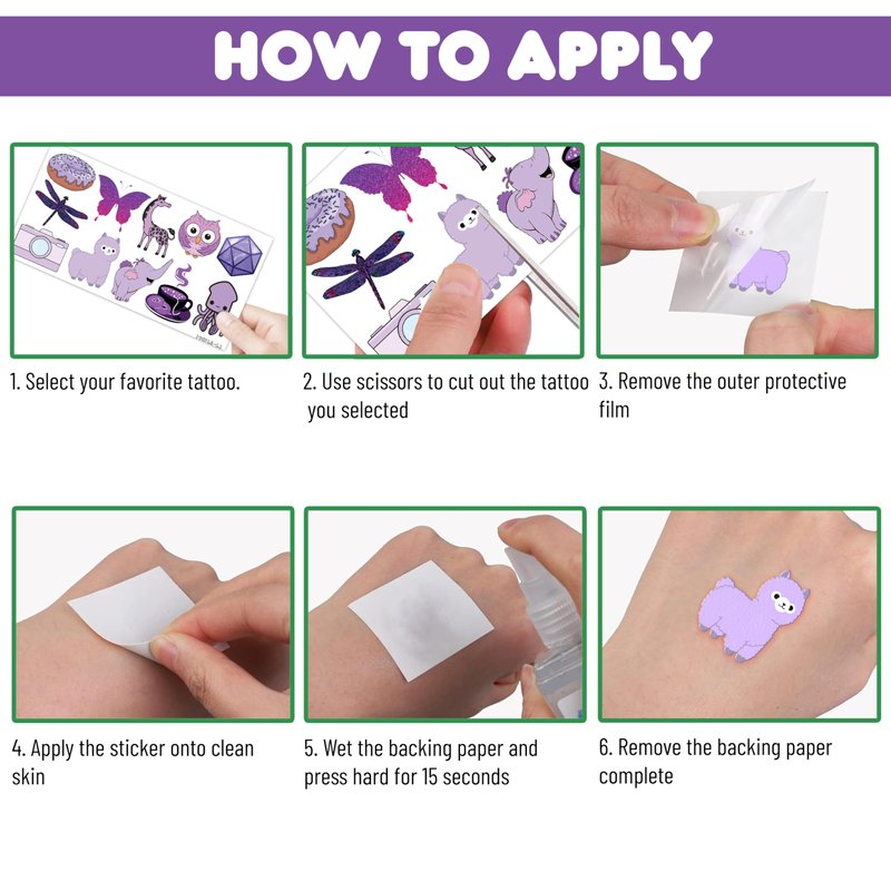 - 💜 EASY TO USE AND REMOVE : You can place them on your hands, arms, face, or any comfortable area. Simply cut out each tattoo from the sheets and remove the clear protective layer. Wet the tattoo thoroughly with water, wait for 20-30 seconds, and then remove the backing paper. The result will be a velvety, long-lasting tattoo.