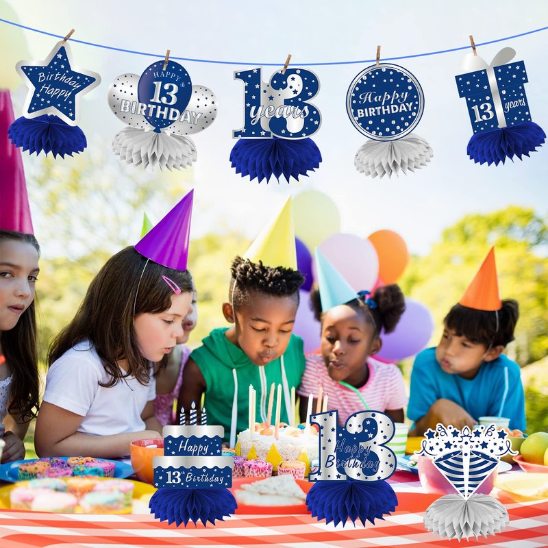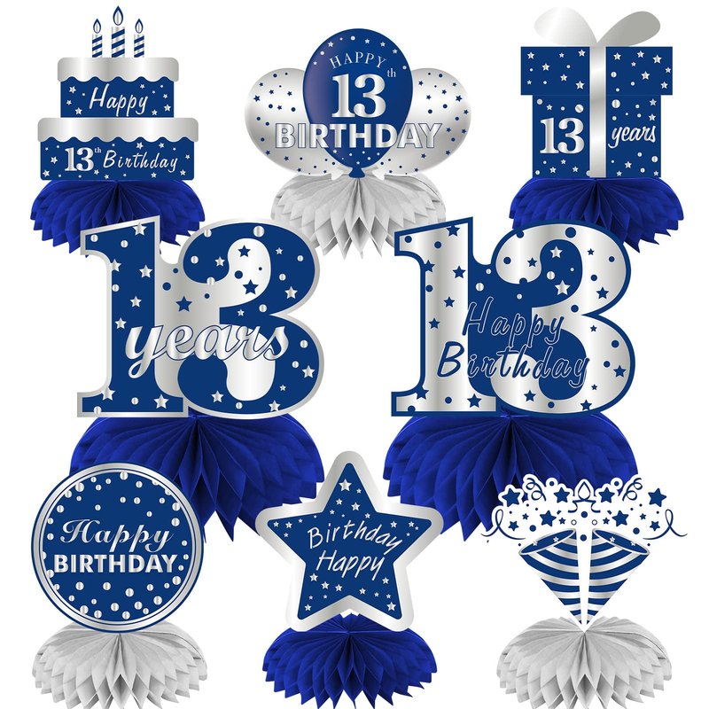 - [You will get] - 8pcs 13 year old blue and silver birthday themed party table decorations, including 8 13 year old birthday pattern cardboard and 8 paper honeycomb balls (5 blue, 3 silver).