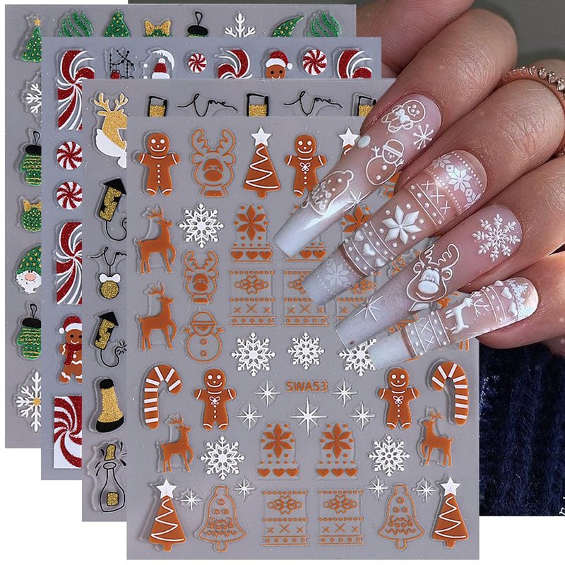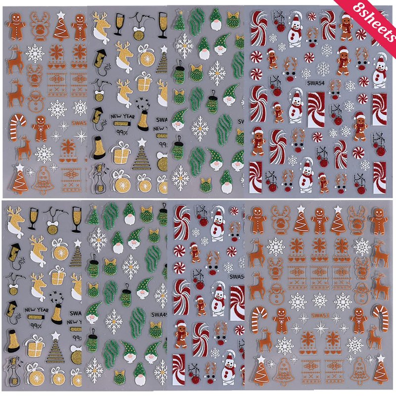 - 【Christmas Nail Stickers Set】: 8 Sheets of 3d self-adhesive Christmas nail decals are designed with classic Christmas patterns, snowflake,penguin,elk,Gingerbread man,Christmas tree,car,Santa Claus,snowman,ant other pattern. It can create your own holiday nail art