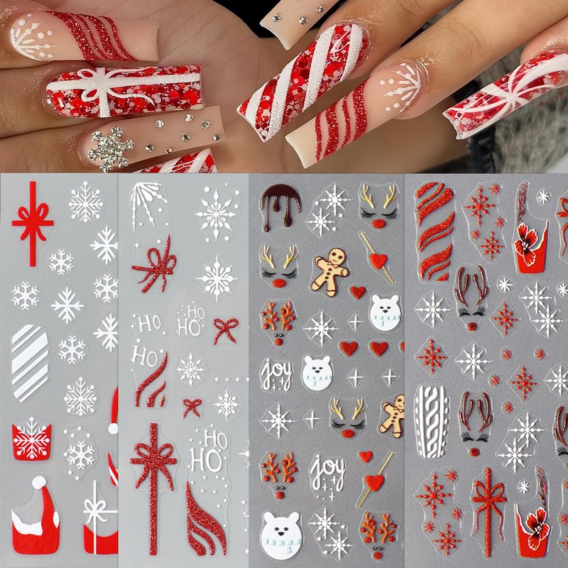 - Easy to Use: This santa hat nail stickers for nail art is self-adhesive. just use tweezers to tear off the cute nail stickers, and then stick the 5d elk gift box bow nail stickers on the nail.You can also use nail gel to cover to make the beautiful stickers last longer