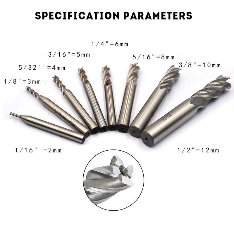 - One Set of metric end mill bits Including: 8 Different kinds of Size end mills to meet your need, 2mm=1/16", 3mm=1/8", 4mm=5/32'', 5mm=3/16", 6mm=1/4", 8mm=5/16", 10mm=3/8", 12mm=1/2"