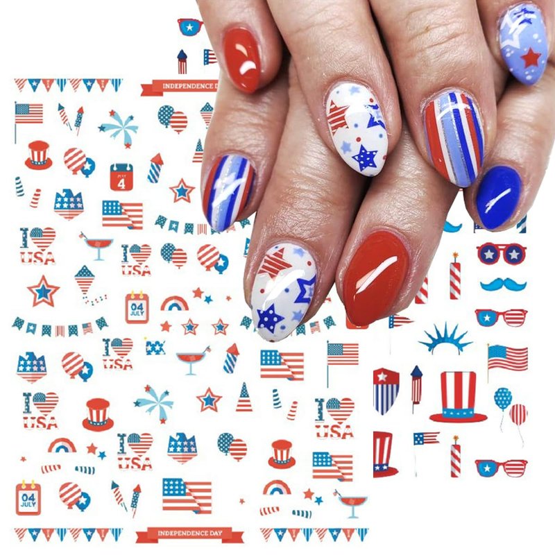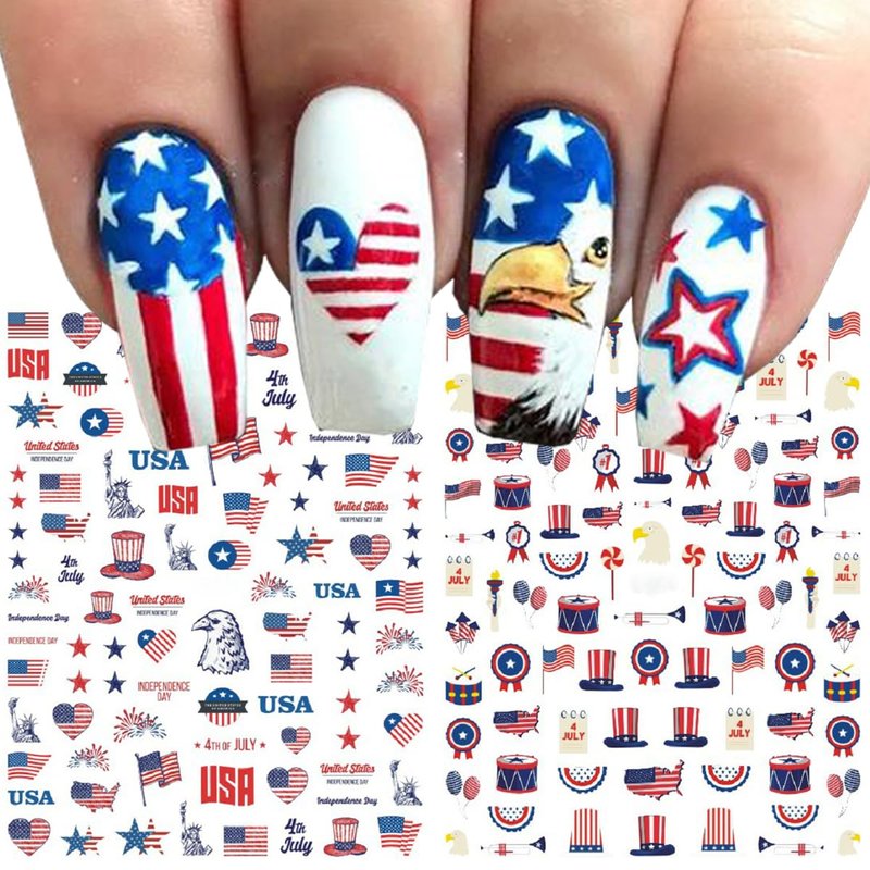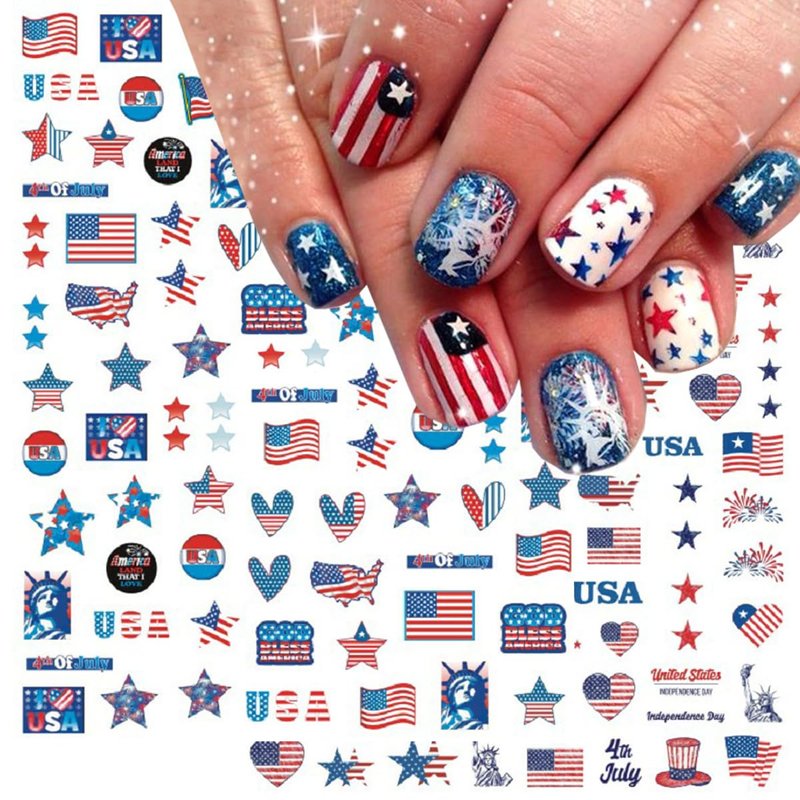 - Easy to use: USA Independence Day 3D designer nail stickers is self-adhesive and requires no glue, just remove sticker then stick this 3D nail decals on your nail. Apply top coat gel to seal to make the stickers last longer.