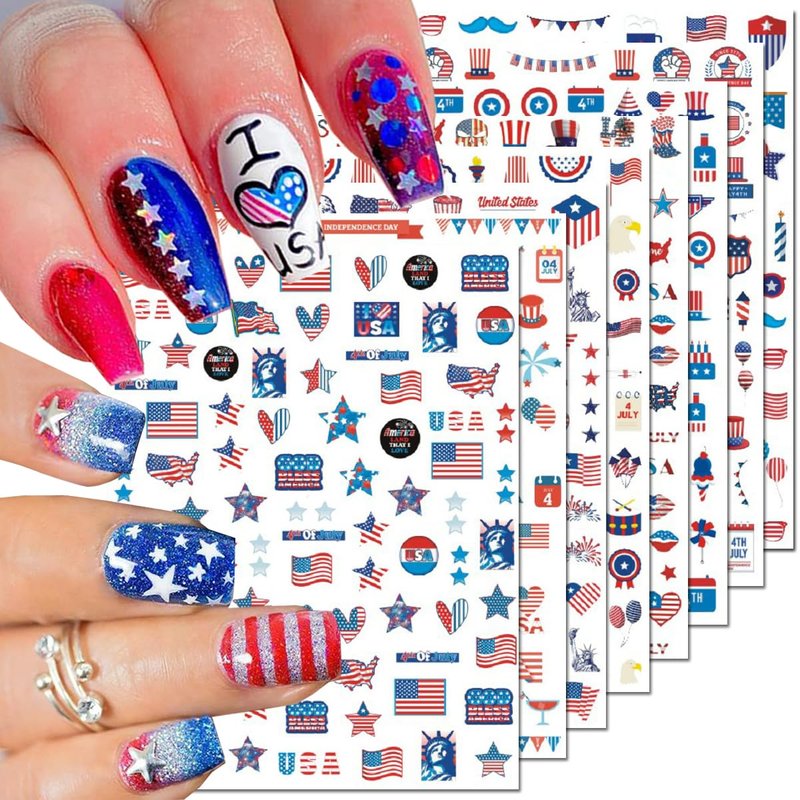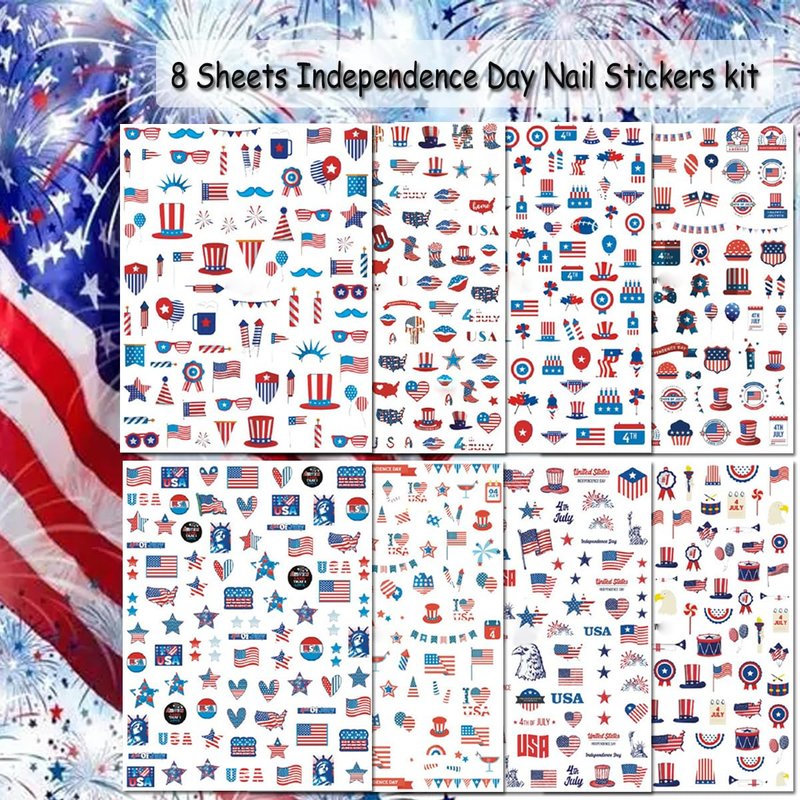 - Quantity:You will get 8 sheets delicate American Independence Day nail art stickers ,variety of styles, American flag nail stickers are suitable for decorating various nails, including gel nails, acrylic nails, fake nails, nail tips, etc.suitable for you to DIY nail design