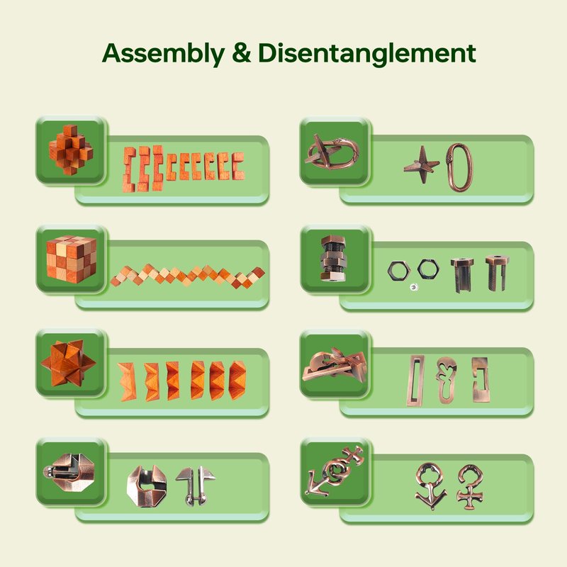 - Wooden and Metal Puzzles: 8 pieces of puzzles for adults and kids, enjoy brain teaser puzzles games can avoid gadgets and electronics, learning with novelty idea, exercise dynamic brain skills.