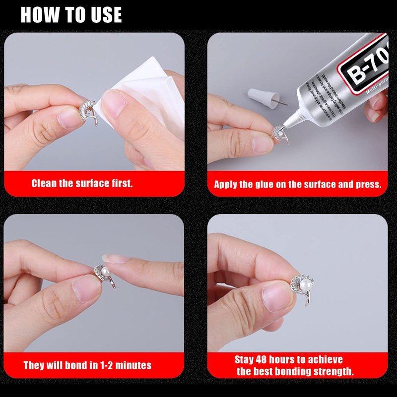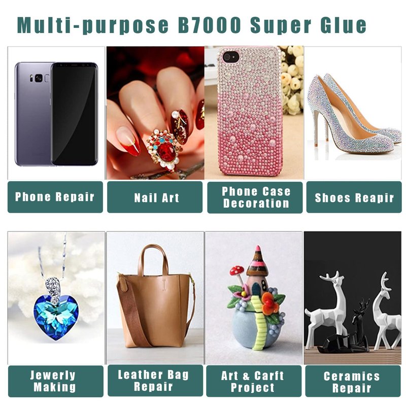 Multi-Purpose B7000 Adhesive Glue: Compared to other glues, the B7000 craft glue can permanently bond various materials, which is great for jewelry making, nails art, phone repair, electronic accessories, toys repair, metal, glass, cloth, leather, rubber, fibre, paper, ceramics, wood, textile, nylon, PVC, or other crafts repair purposes.