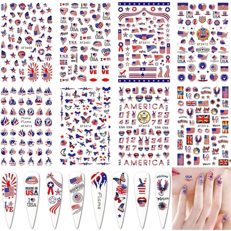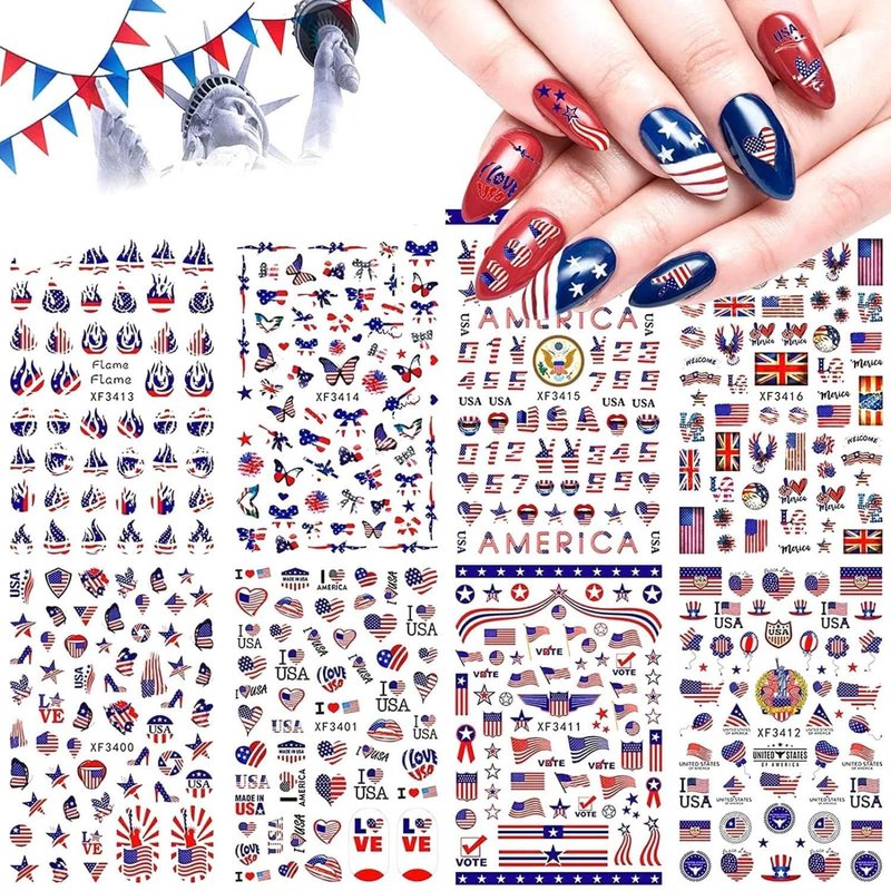- 🔥Flag Day nail stickers: The package comes with 8 sheets July 4 Nail Art Stickers. various patterns for your choice, such as the American Flag, flame, and alphabet National emblem patterns with red, blue, and white colors. each paper size 3.54 x 3.15inches.